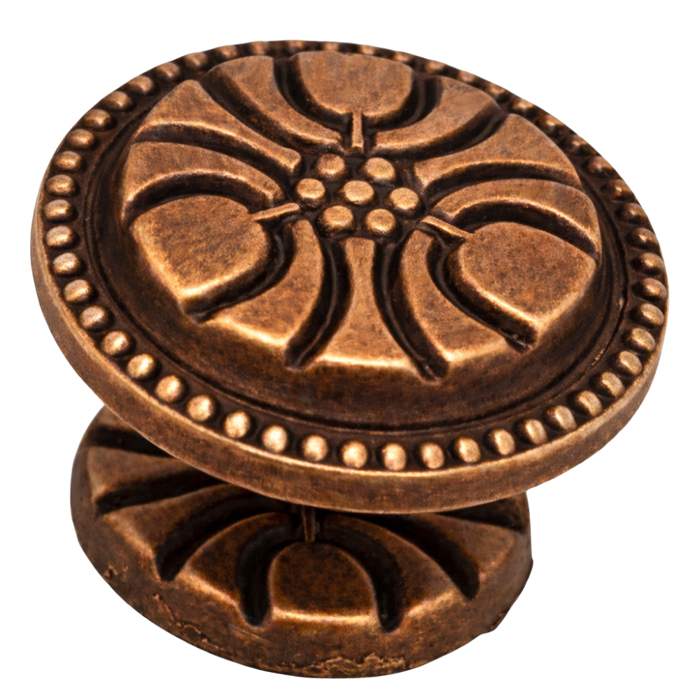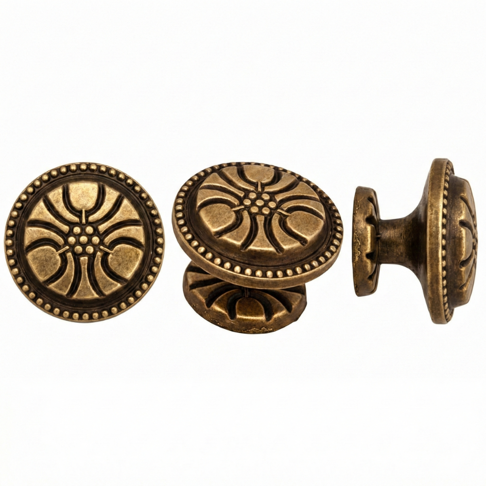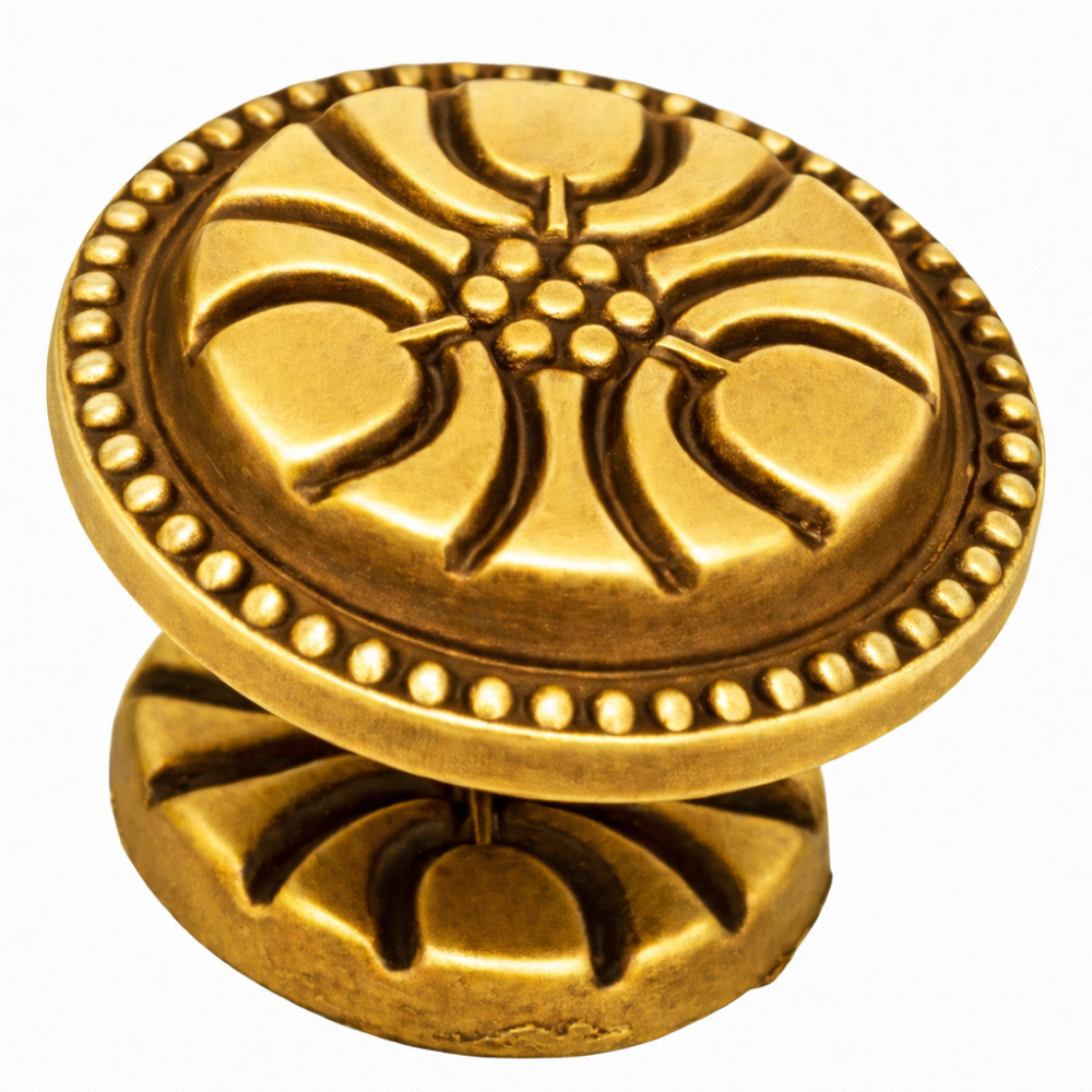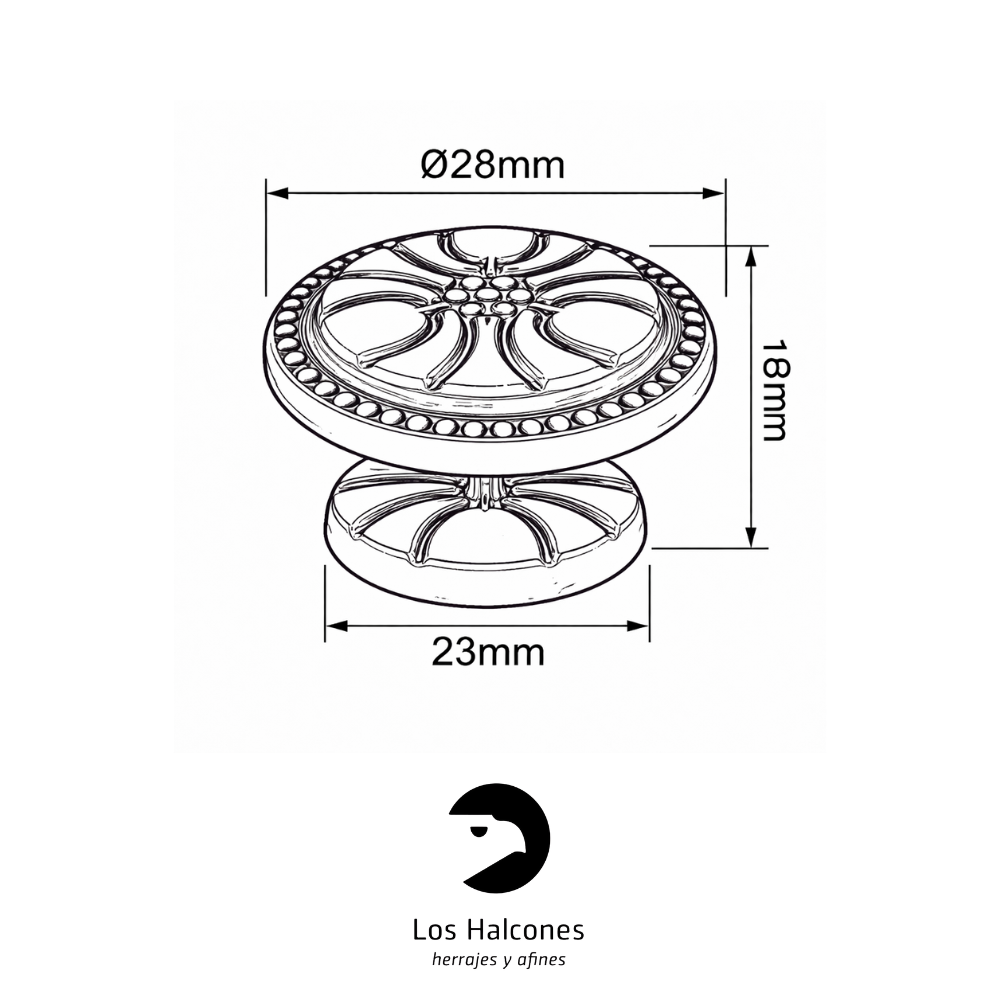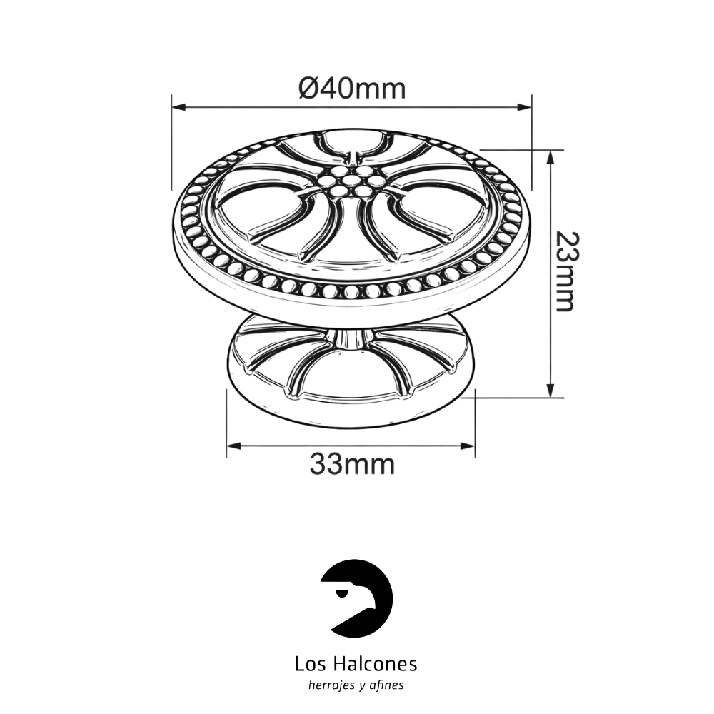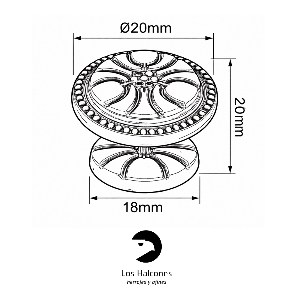 Tirador tipo pomo con diseño floral clásico, ideal para muebles antiguos, restauración y estilo vintage. Fabricado en metal resistente, de fácil instalación y disponible en varios diámetros y acabados. Incluye tornillo.